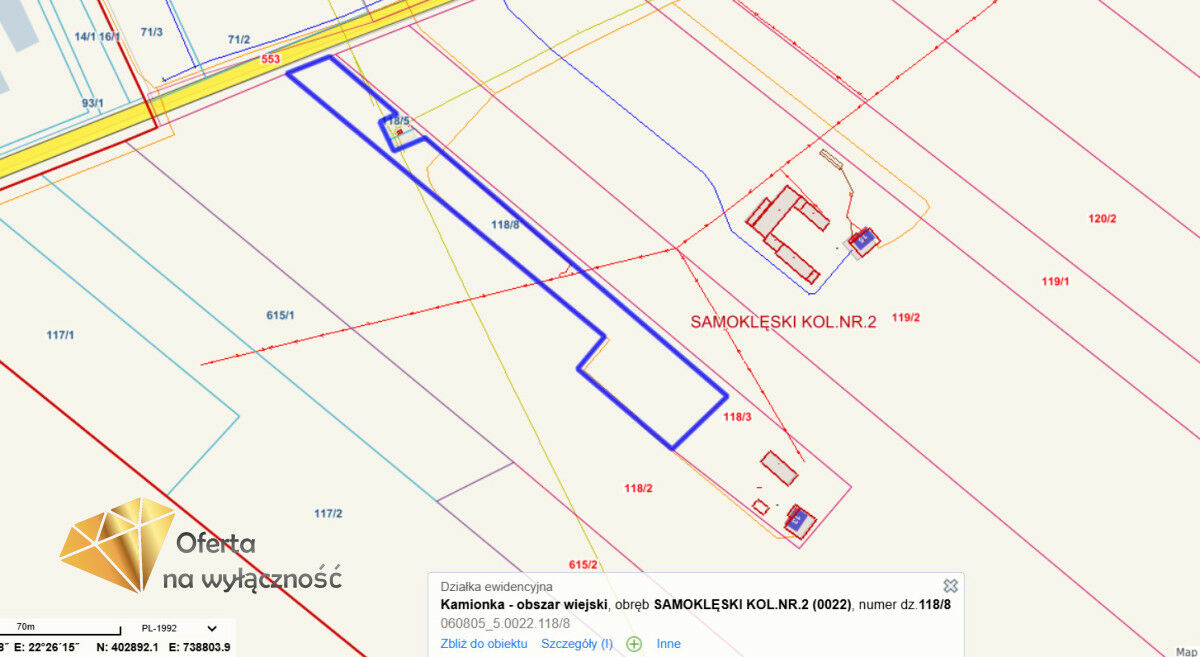 Nieruchomość gruntowa położona w miejscowości Samoklęski, 5 km od Kamionki, gdzie znajduje się cała infrastruktura, 19km od Lubartowa i 14km do trasy S19.